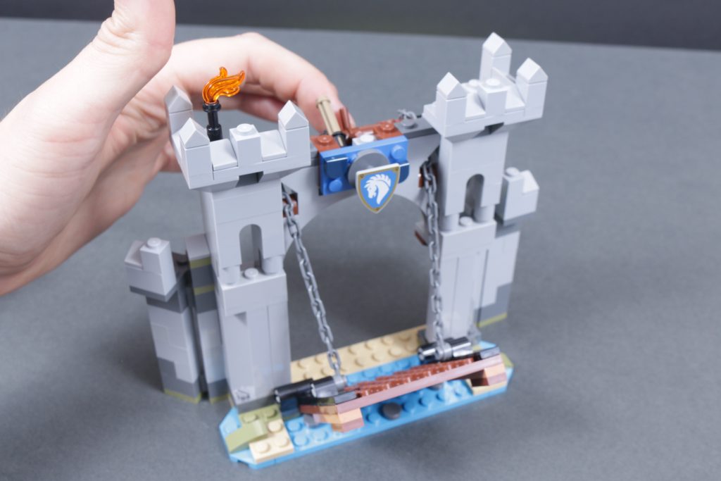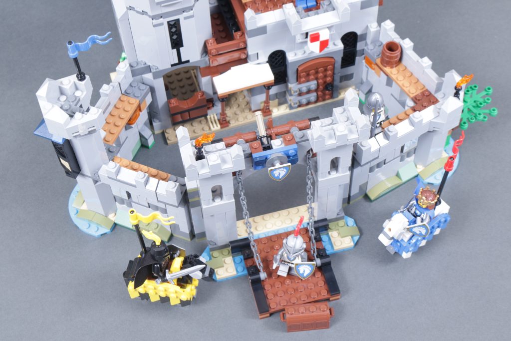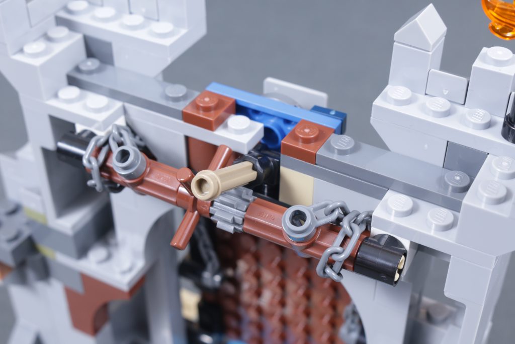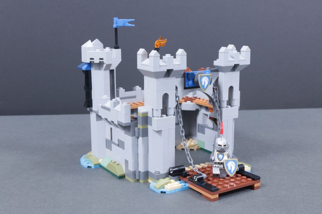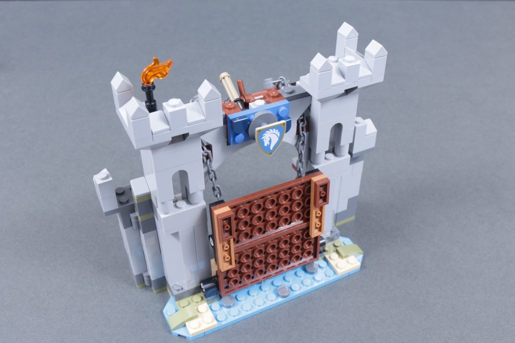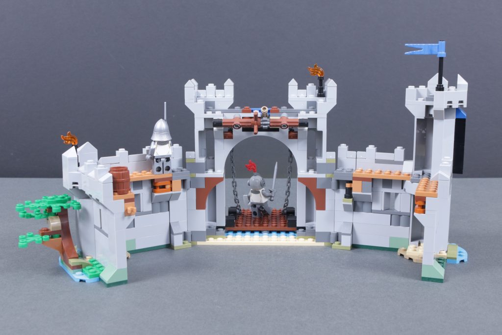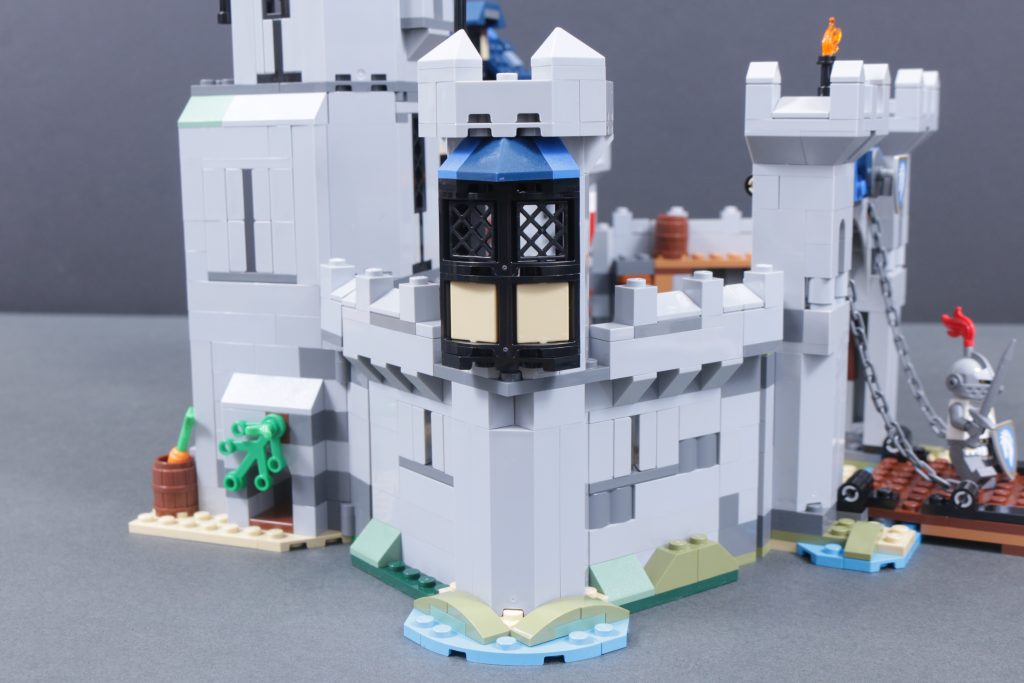 As características e detalhes do castelo são bem projetados em sua maior parte e são muito exclusivos deste castelo - as ameias em particular (topos das paredes do castelo) são moldadas de forma muito bonita e de uma forma que não vimos em anteriores LEGO Castelos. Podem ser pequenos detalhes, mas sempre ajudam a moldar o caráter e a identidade da fortaleza. A função da ponte levadiça no portão principal é uma construção simples, porém inteligente, muito eficaz, e sugere um fosso que provavelmente circunda o castelo, assim como várias placas azuis que margeiam as muralhas externas.