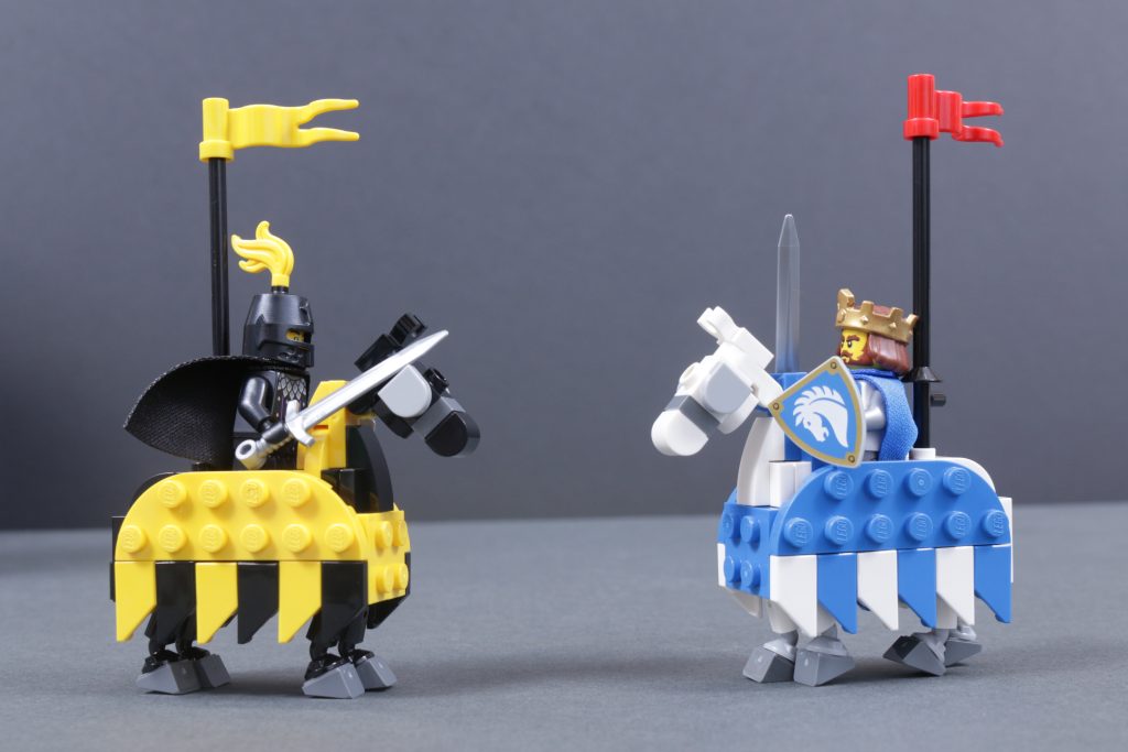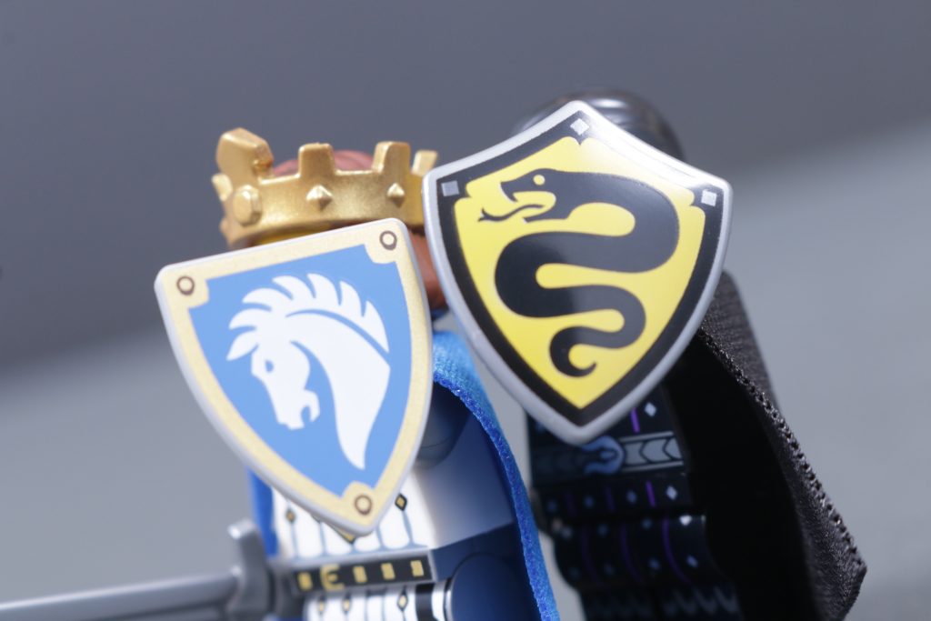 Estes cavaleiros a cavalo têm um design maravilhoso, refletindo muitos dos mesmos detalhes que vimos nos Cavaleiros Leões e Falcões Negros atualizados, ao mesmo tempo que oferecem uma paleta nova e – deixando de lado os usos menores da cor – refrescante para basear suas construções e modelos de exército do Castelo. Aliás, pensando no Paladino da série D&D CMF, a qualidade da impressão da túnica branca nas pernas planas prateadas é de altíssima qualidade e contraste, enquanto no Paladino a mesma combinação de cores não era tão forte.