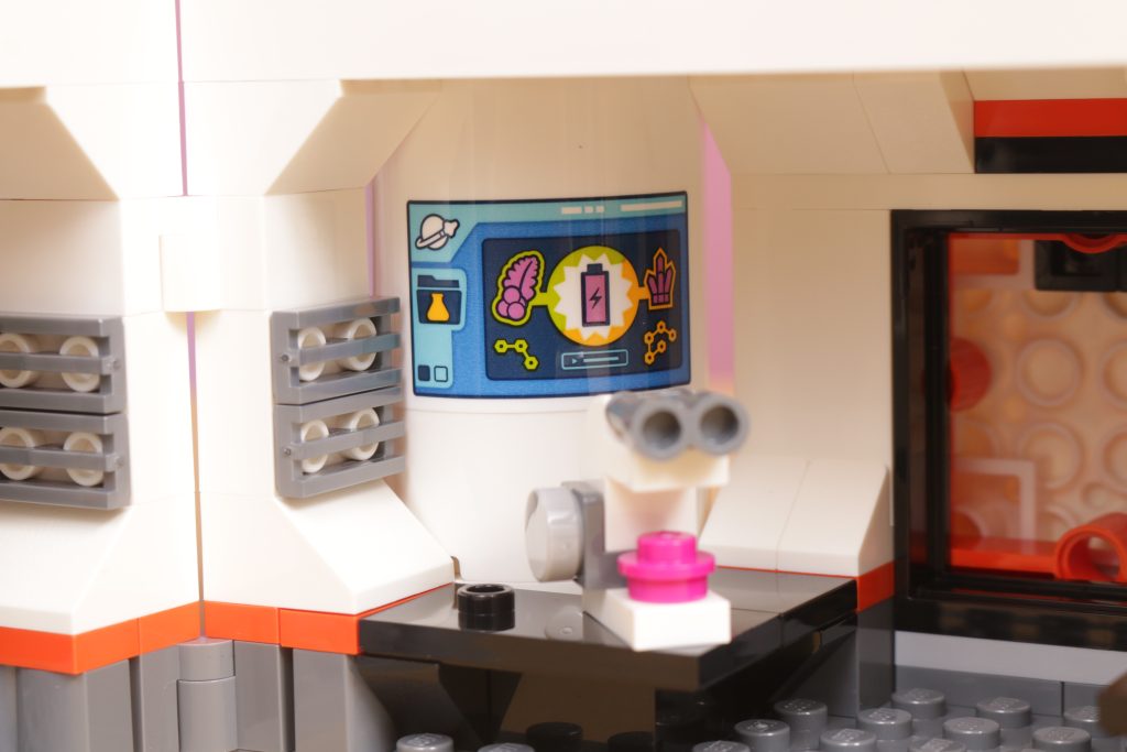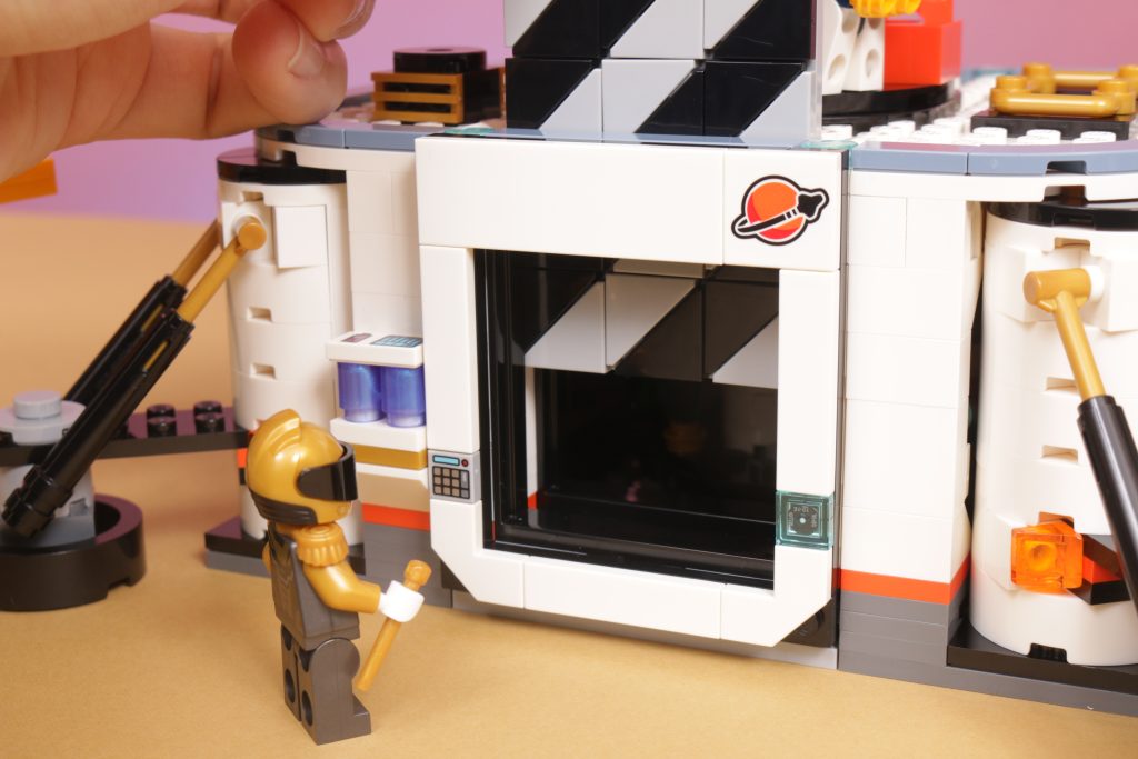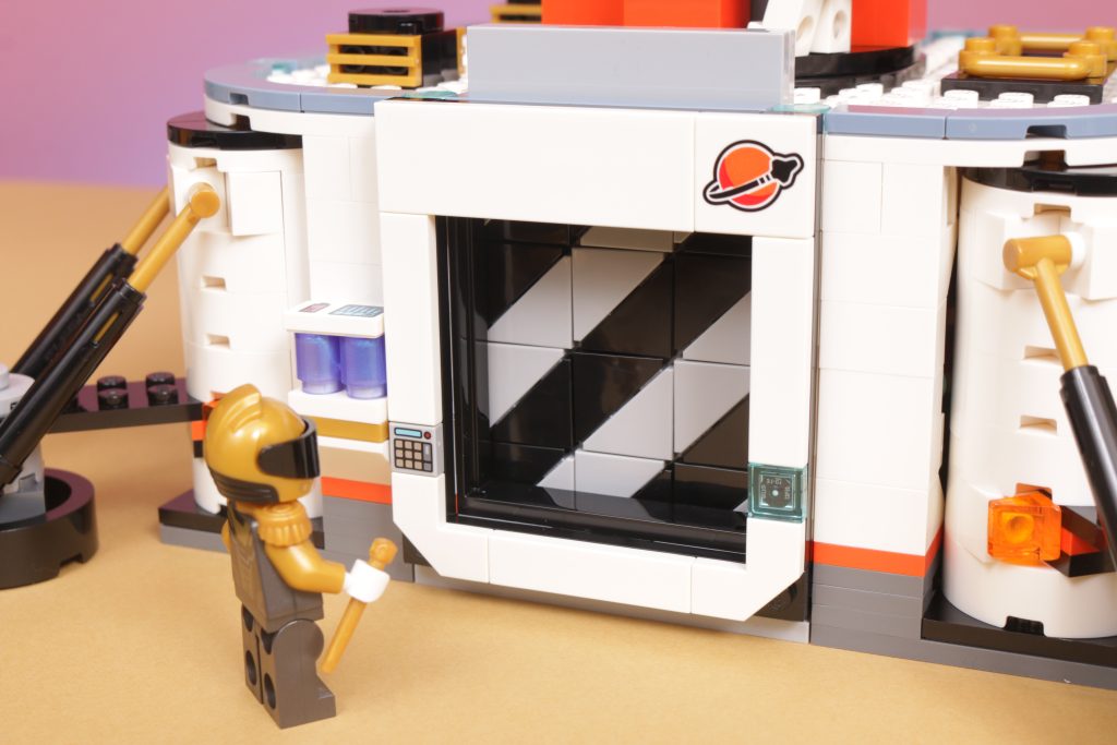 De fato, fechado ou aberto, o nível do solo da base captura uma verdadeira sensação de ficção científica moderna em sua estética, em particular parecendo o tipo de coisa que você poderia encontrar ao jogar qualquer um dos videogames espaciais recentes, principalmente pela porta da frente elevável, como o design usa toques de laranja e preto em uma paleta predominantemente branca e pelos quatro cantos arredondados com esse detalhe para sugerir que a base foi ancorada ao solo.
