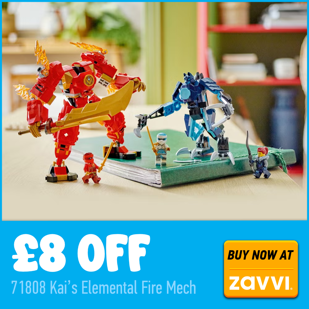 A loja também possui conjuntos destinados a brincar, como... 71808 Mecha de Fogo Elemental de KaiO preço caiu de £24.99 para £16.99. Inclui a minifigura rara da Jordana, além de dois robôs para brincar.