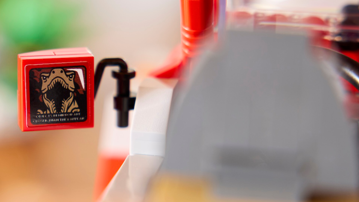 Outra versão do conjunto 77984 Jurassic Park Jeep Wrangler reproduz a cena do primeiro filme em que o T. rex persegue o carro de Ellie Sattler e pode ser visto se aproximando pelo retrovisor. Esse mesmo elemento foi recriado no próximo conjunto LEGO. Jurassic World Conjunto completo, com um adesivo de dinossauro imponente no espelho, mais perto do que você imagina.