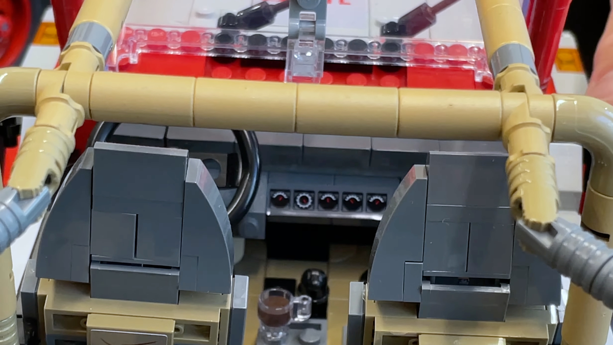 O interior do LEGO Jurassic World O modelo está repleto de ainda mais detalhes e surpresas, incluindo uma xícara de café para imitar as ondulações do líquido quando o T. rex fez sua estreia no filme original dos dinossauros, um cordão do Jurassic Park, novas peças impressas para o painel, bancos traseiros removíveis e muito mais.