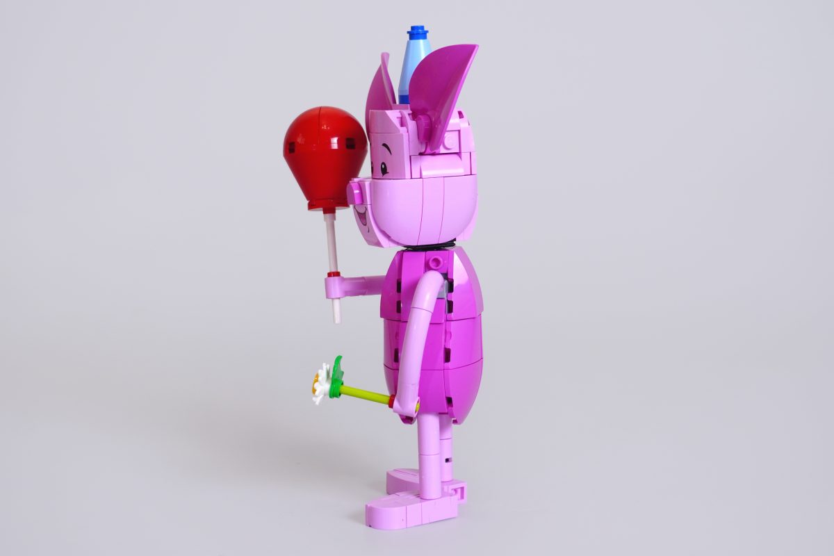 No entanto, embora a cabeça do Leitão seja particularmente bem feita (e muito mais charmosa do que a cabeça do Ursinho Pooh feita de peças), seus membros finos deixam a desejar. Isso se aplica principalmente aos seus braços, que são feitos com peças de macarrão e juntas esféricas que não têm a amplitude de movimento que se esperaria de um personagem desse tamanho. Idealmente, o Leitão deveria ser articulado o suficiente para permitir algumas poses diferentes, mas, na prática, há limites para o quanto seus braços podem se mover, especialmente considerando que ele segura um grande balão vermelho em uma das mãos, que tende a bater na cabeça se não estiver posicionado corretamente.