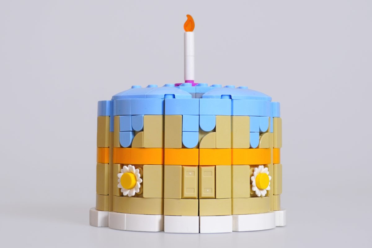 O Leitão de LEGO fica ofuscado pelo seu próprio bolo de aniversário.