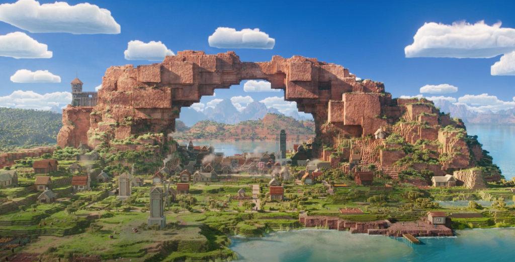 As primeiras cenas de "Um Filme de Minecraft" mostram muitos dos mobs e locais do jogo, incluindo o Mundo Superior, além de ovelhas, lhamas, piglins e ghasts. O visual e a atmosfera de Minecraft parecem presentes e corretos, com o elenco do filme sendo puxado para o ambiente cúbico por um portal misterioso.