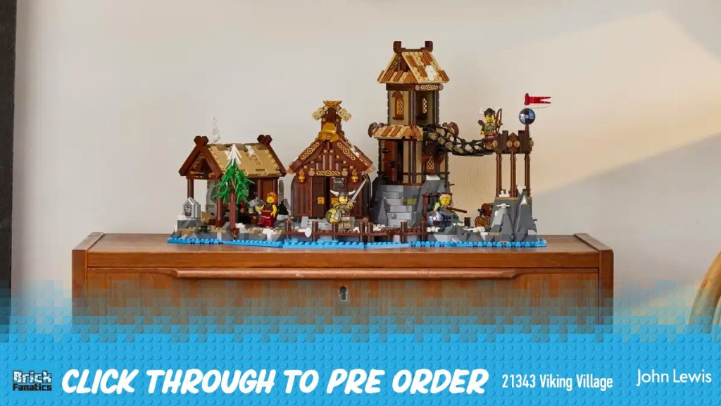 De cima para baixo, LEGO Ideas 21343 Vila Viking é um conjunto impressionante. Os edifícios em estilo de madeira estão repletos de armas, alimentos e tesouros vikings em abundância, com os interiores facilmente acessíveis levantando os telhados revestidos dos edifícios. Todo o conjunto está fixado sobre uma base azul que representa o seu afloramento rochoso no meio do oceano.