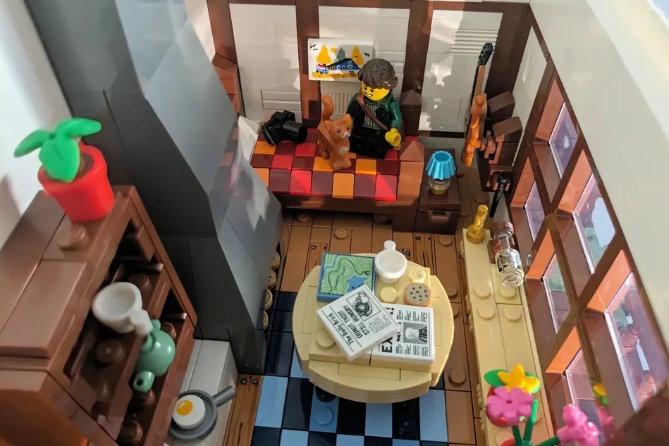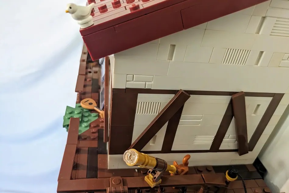A casa de alvenaria foi projetada para ficar encostada na parede. O exterior tem um charme rústico, com um telhado coberto de plantas e paredes com ripas de madeira, criando um efeito de casa de fazenda. O interior conta com uma cama, vários instrumentos musicais, uma mesa e um banco com um navio em uma garrafa, plantas, uma lareira com uma bandeja cheia de biscoitos, uma cozinha aconchegante, uma porta funcional e algumas estantes com um cantinho de leitura aconchegante.