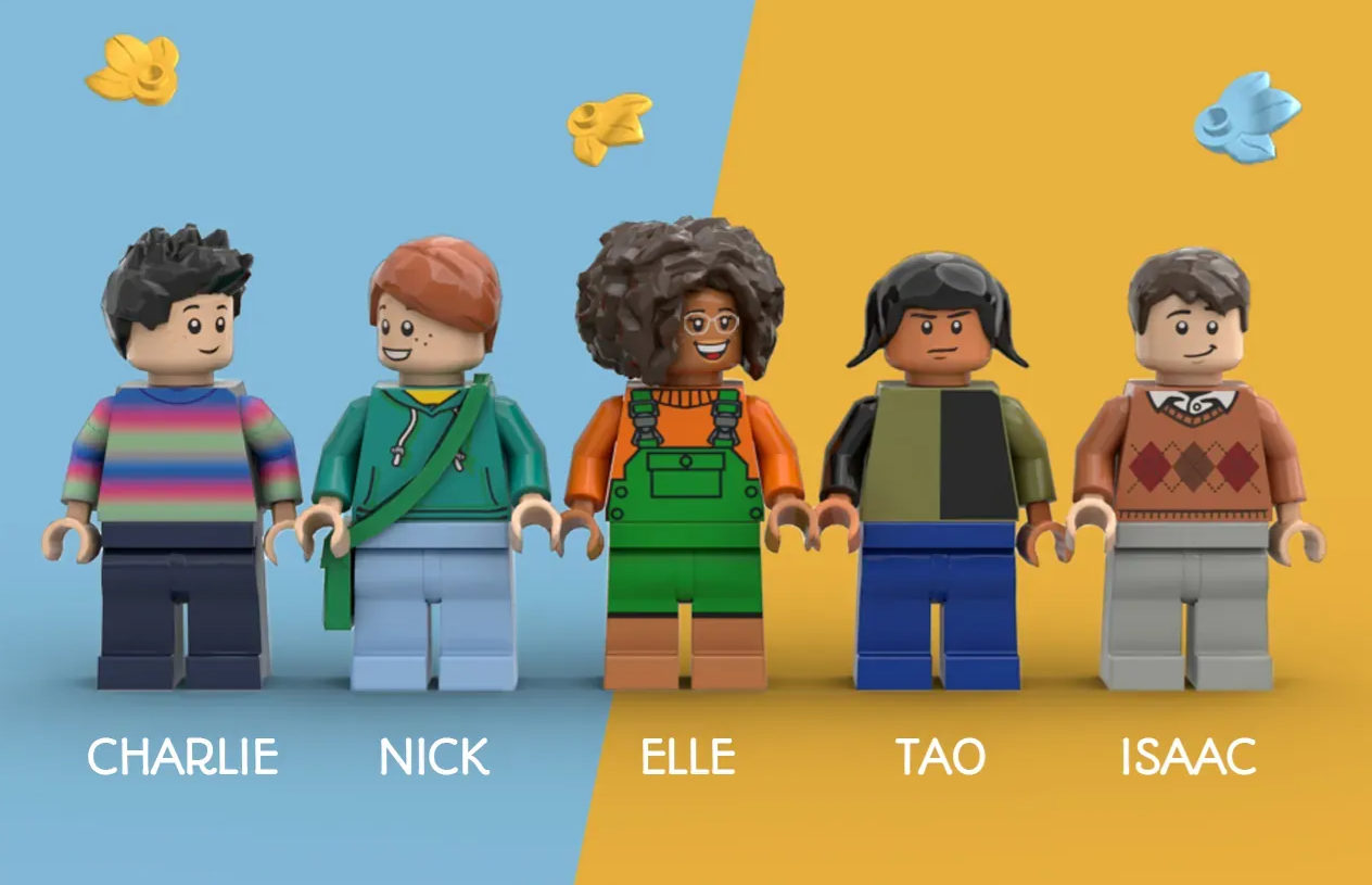 O show se concentra na relação entre Charlie e Nick e só faz sentido que duas minifiguras deles sejam incluídas no projeto junto com Elle, Tao e Isaac.