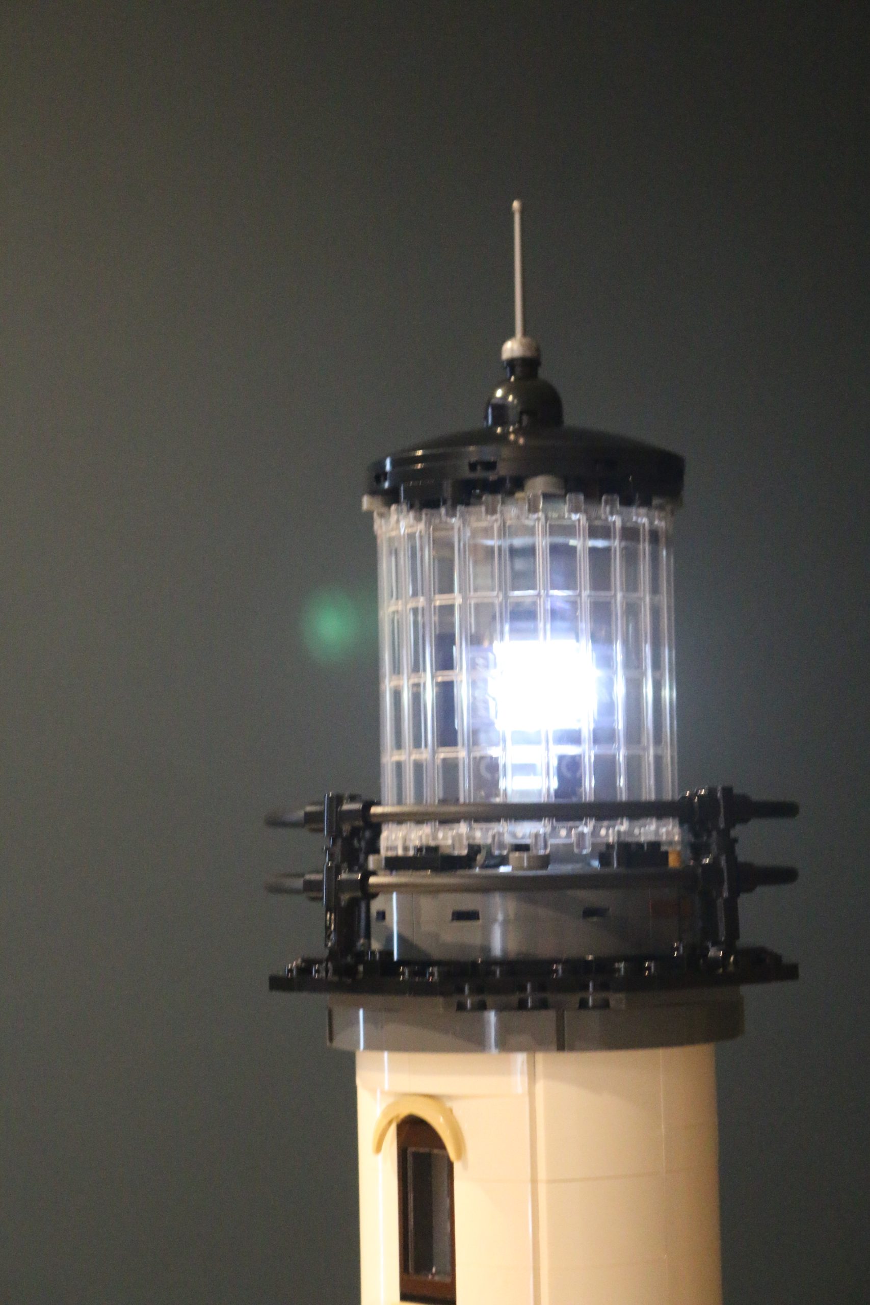 O interior da torre apresenta detalhes baseados em faróis reais e a casa conectada tem um tijolo de luz adicional para a lareira brilhante.