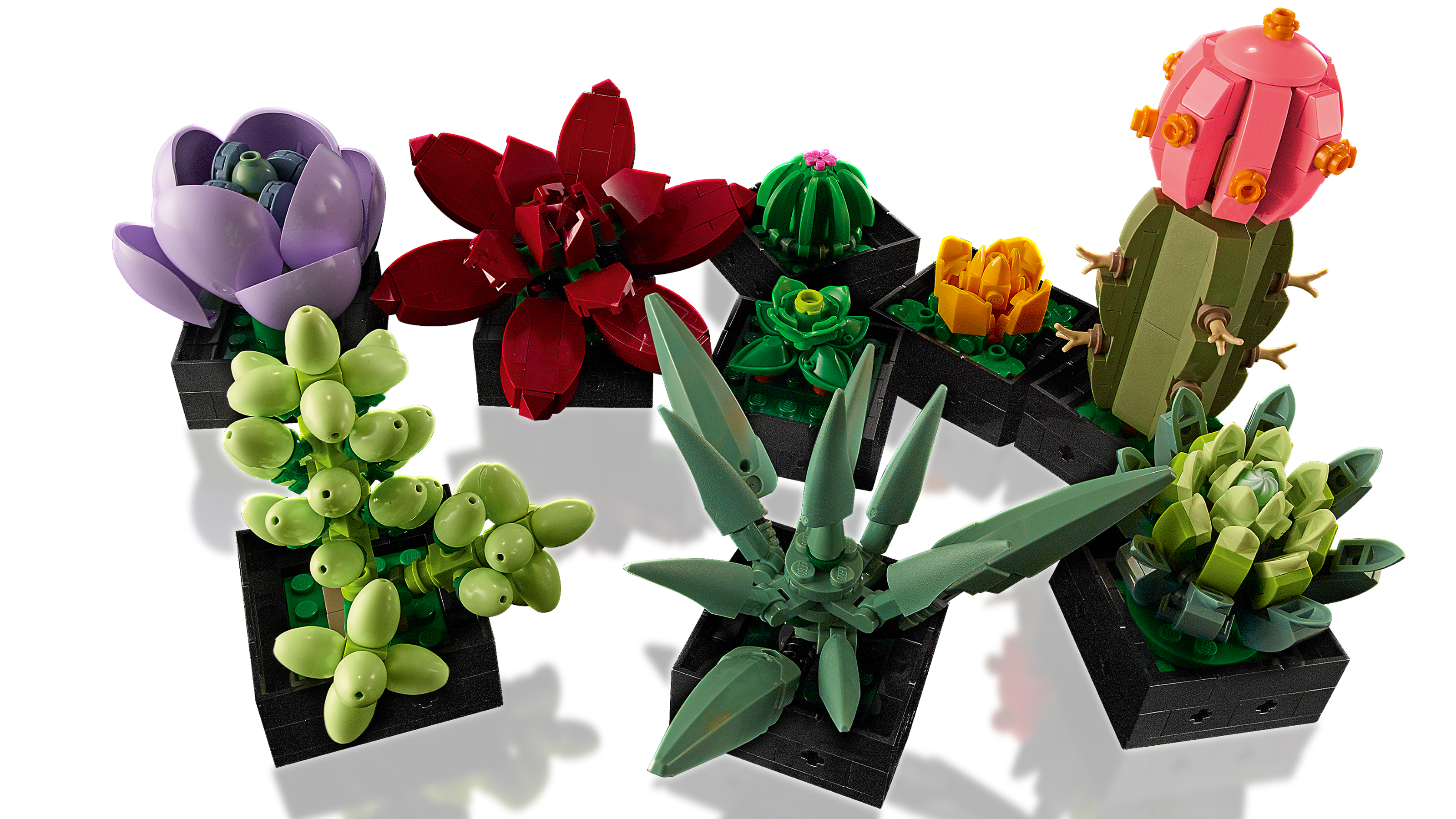 10309 Suculentas apresenta modelos que parecem inspirados em um monroe laranja, uma planta de babosa, uma galinha e pintinhos, uma echeveria vermelha e lavanda, um cacto lunar, um cacto bola, um rabo de burro e um sedum luteoviride. As plantas em 10329 Plantas Minúsculas são uma armadilha de Vênus, uma sundew vermelha, plantas de jarro, uma suculenta sem nome, uma pera espinhosa e um cacto de almofada de alfinetes, bem como uma planta de jade, um trevo falso e uma folha rendada.