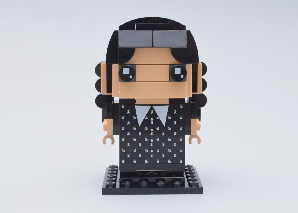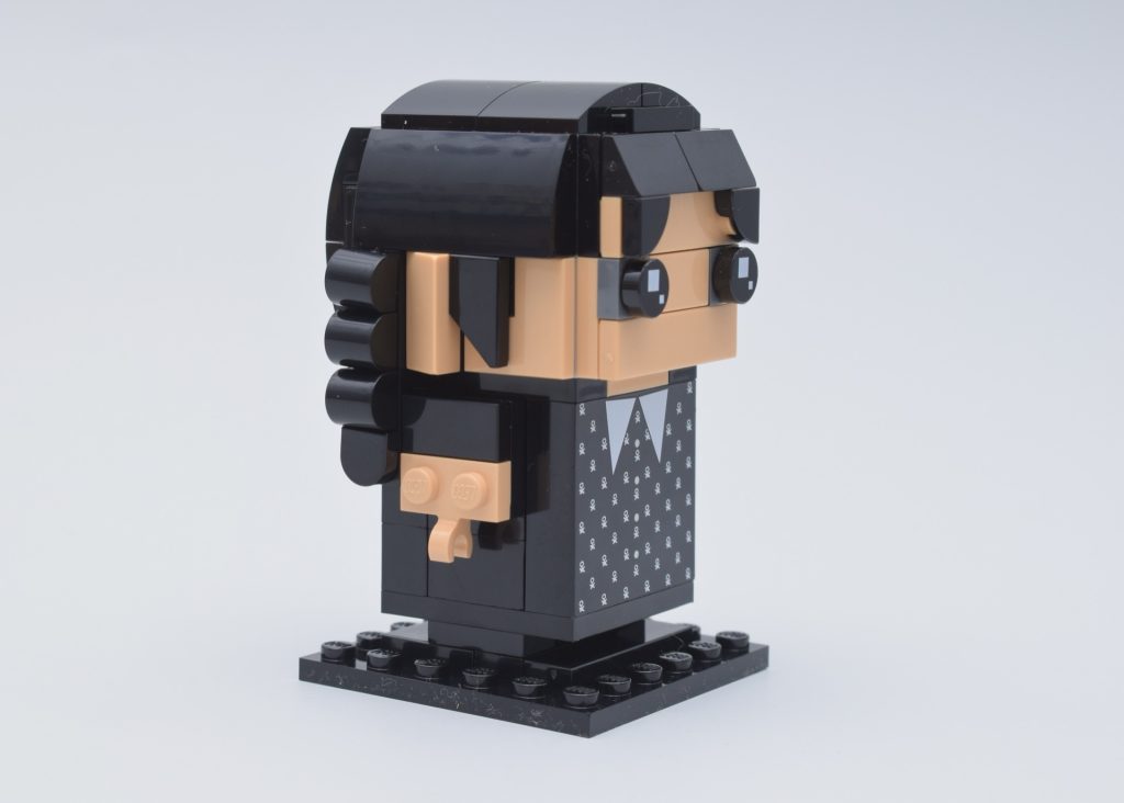 O LEGO BrickHeadz o olhar pode ser assustador e um pouco vazio às vezes, graças aos pinos espelhados para os olhos. Felizmente, isso se presta perfeitamente a uma Wednesday Addams BrickHeadz, uma adolescente conhecida por seu olhar impassível e nunca por seu sorriso. A simetria rígida de suas tranças e o rosto sem traços significam que Wednesday é instantaneamente reconhecível nesta forma.