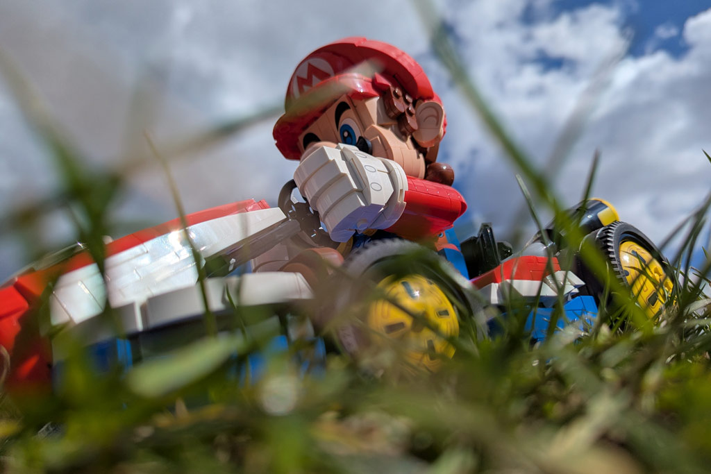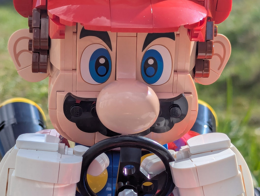 O kart possui direção e também pode ser colocado em um suporte para levantá-lo ligeiramente do chão para opções de exibição mais dinâmicas. E embora Mario não possa ser reorganizado em uma pose completamente diferente, sua cabeça e braços são articulados, então você pode fazê-lo olhar ao redor e acenar para (ou jogar cascas de banana em) outros corredores. A análise também destaca a falta de adesivos – tudo é impresso – e as duas novas peças usadas para obter as características faciais de Mario construídas com tijolos.