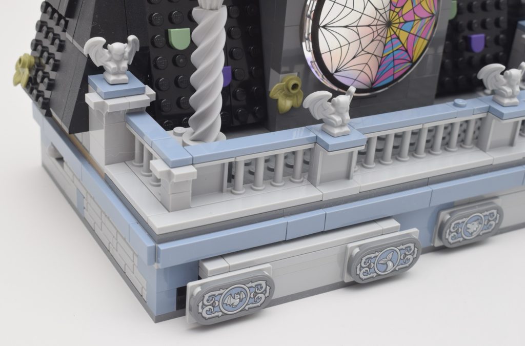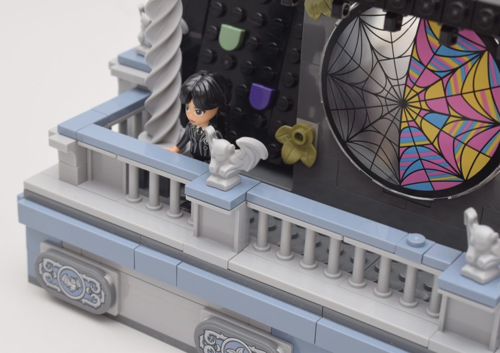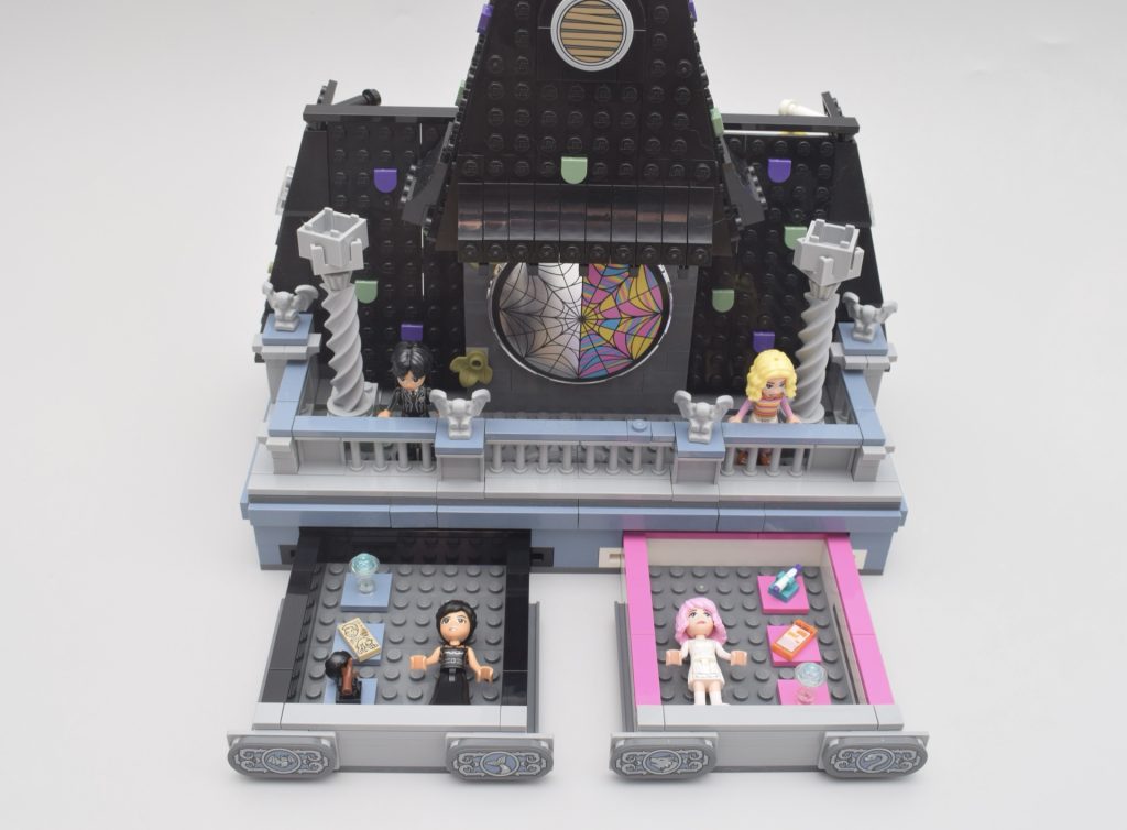 Isso é ajudado pela riqueza de acessórios incluídos na construção. A divisão no meio é executada perfeitamente, separando as personalidades das duas meninas. É mais claramente visto através do fantástico elemento da janela, com metade de vitrais coloridos e metade de teias de aranha e monocromático. O lado de Enid sem dúvida tem mais acontecendo, mas isso se encaixa com seu estilo, empilhado com pôsteres, brinquedos fofinhos e cores vibrantes.