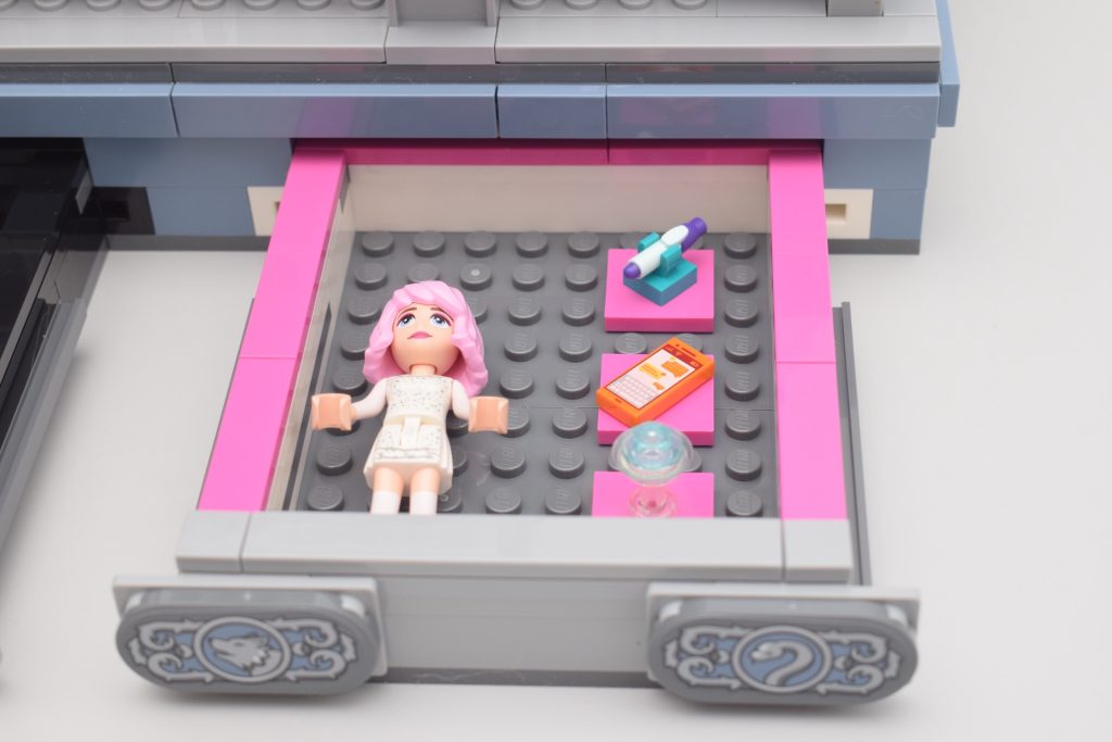 A única parte da construção que pode parecer menos madura são as gavetas na base – mas para qualquer um que tenha brincado com Polly Pockets em algum momento da vida, isso vem com uma dose saudável de nostalgia. Um botão na lateral da construção libera as gavetas, então não há deslizamento aleatório quando você está organizando o conjunto. Os acessórios e mini-bonecas dentro também são bem protegidos, marcando uma maneira inteligente de incluir ainda mais em 76781 Quarto do dormitório de Wednesday & Enid.