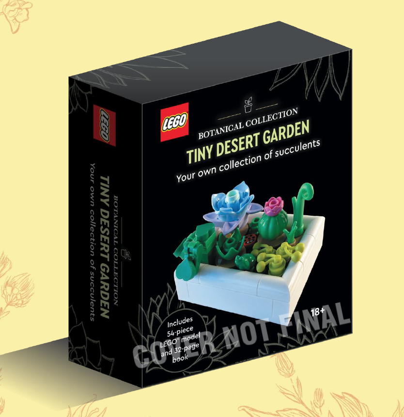 O primeiro livro é LEGO Botanical Collection: Tiny Desert Garden, um livro de bolso com 32 páginas que explora o fascinante mundo dos cactos e suculentas. Em uma caixa com abertura lateral, o livro vem com um modelo LEGO Desert Garden de 54 peças para montar, completo com bandeja, planta-cobra, colar de pérolas, cacto-barre e joaninha estampada.
