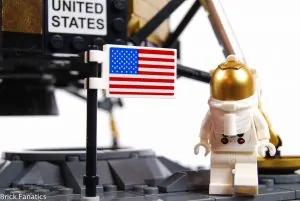 10266 é notável também como um exemplo quase perfeito de como usar adesivos corretamente. Existem muitos fãs que preferem elementos impressos em vez de adesivos, mas isso realmente não teria sido uma opção aqui. O Módulo Lunar do mundo real era altamente reflexivo devido às finas folhas de metal usadas para manter o peso baixo. Essa qualidade quase de papel alumínio é imitada graças aos adesivos reflexivos. Os adesivos também mostram a bandeira, a placa atrás da escada e o painel dos Estados Unidos - todos vitais para capturar a aparência do veículo real. A execução é perfeita. Estes, emparelhados com as minifiguras que parecem ter saído do agora clássico filme Apollo 13, realmente vende isso como vindo direto do Programa Espacial da NASA.