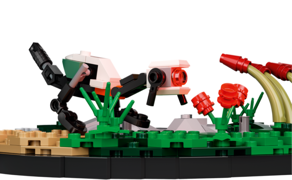 Tudo se passa em uma base de exibição preta – muito parecida com a recém-revelada T. rex Breakout 76956 – que evoca os elementos do mundo de Horizon, retratando uma paisagem coberta de vegetação com grama alta, uma bétula e até mesmo um semáforo enferrujado. O Observador também inclui peças translúcidas em azul, amarelo e vermelho para simular seus vários estados de alerta (dócil, cauteloso ou agressivo).