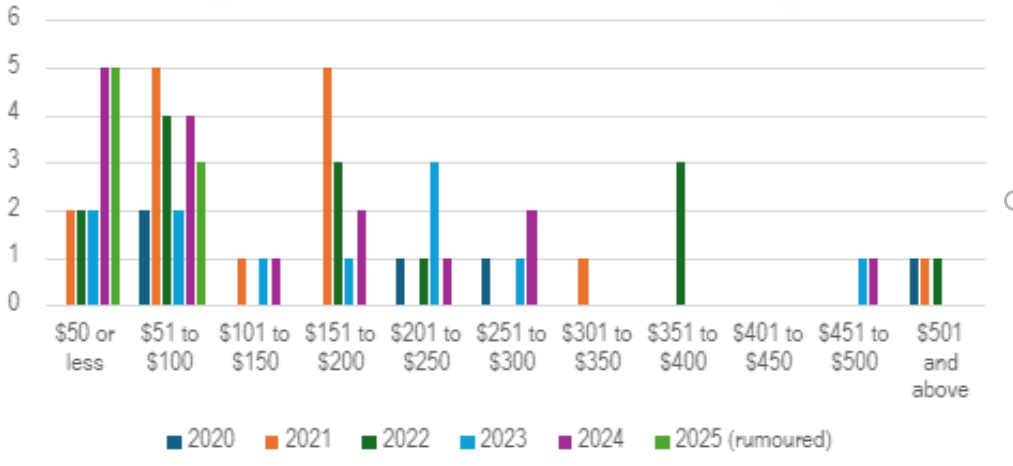 Aqui estão os dados visualizados em um gráfico. Você notará que 2024 e 2025 têm o maior número de conjuntos abaixo de US$ 100 no geral.