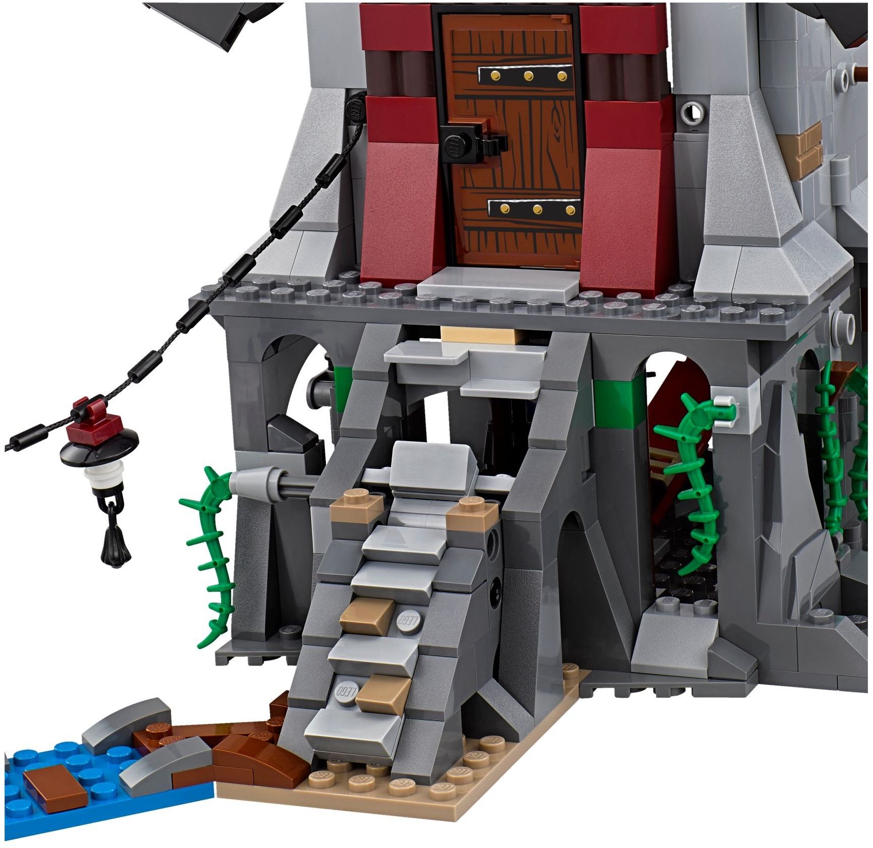 70594 The Lighthouse Siege é muito mais um playset, oferecendo recursos como uma tirolesa externa e várias minifiguras para brincar. O próprio farol está cheio de dissuasores ocultos: um alçapão que deposita os visitantes em uma cela de prisão, bombas que podem ser lançadas de seu meio e um protetor com mola disparado de debaixo de uma mesa. Há também uma escada que desce quando o farol é desdobrado e – é claro – o tijolo de luz necessário no topo.
