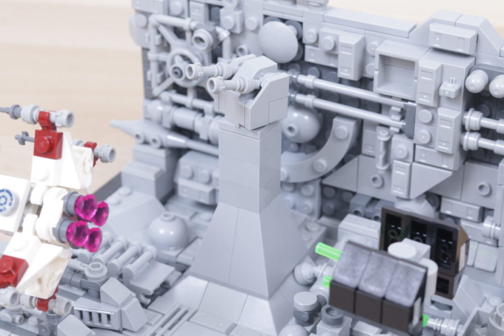 É uma observação que se aplica também ao restante do conjunto, com uma série de peças diferentes compondo a trincheira da Estrela da Morte, criando uma superfície repleta de detalhes, profundidade e todos os tipos de detalhes e detalhes que uma peça projetada especificamente para ficar em exposição precisa para prolongar sua vida útil e atrair a atenção na sua estante. Você precisa de um motivo para olhar para um conjunto LEGO projetado para exposição, e todas as diferentes coisas para observar no Diorama 75329 Death Star Trench Run certamente ajudam a chamar sua atenção.