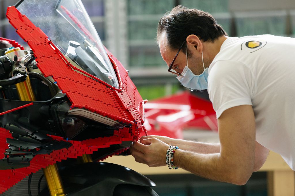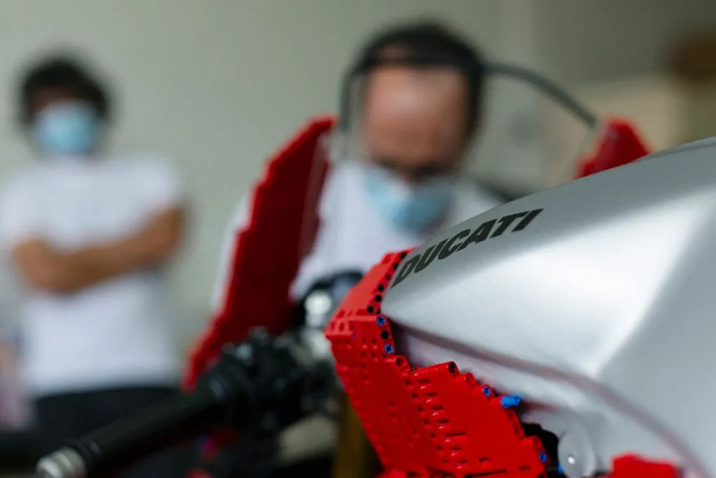 Algumas semanas após o lançamento de LEGO Tecnico 42107 Ducati Panigale V4 R, a LEGO O grupo e a Ducati contrataram o profissional certificado pela LEGO (LCP) Riccardo Zangelmi para construir um modelo em escala 1:1 da motocicleta vermelha de Borgo Panigale.