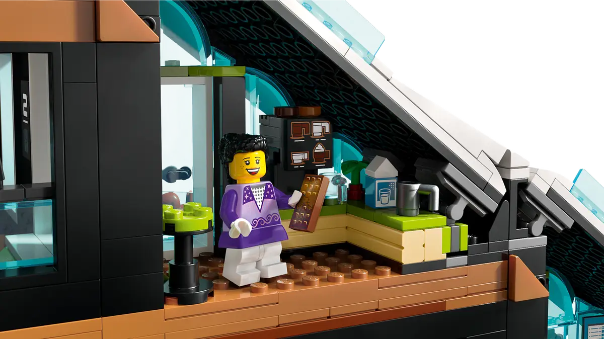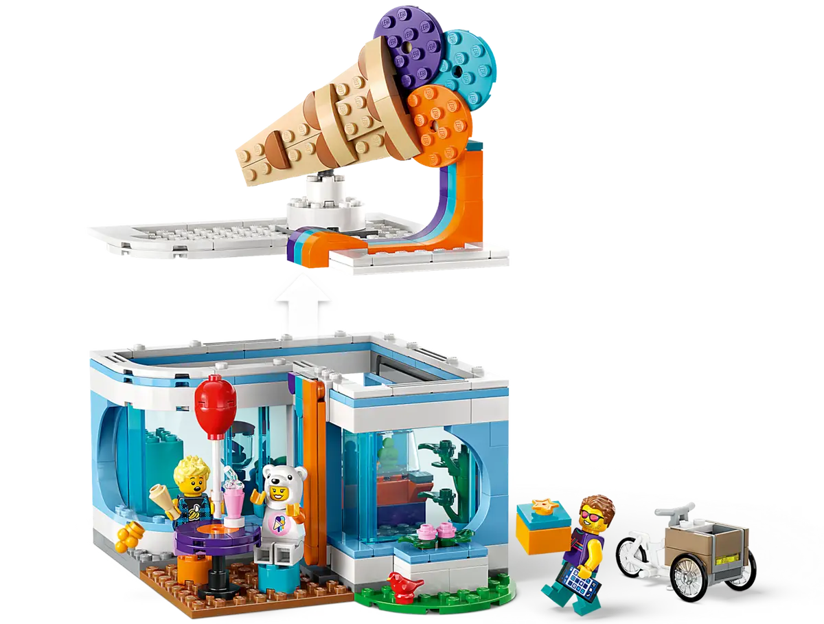 Mudando do salão no nome para apenas uma loja normal, o interior do 60363 Sorveteria mostra um balcão de sorvete, liquidificador e uma geladeira, bem como uma área de estar ao ar livre e uma bicicleta de carga pronta para algumas entregas de sorvete no verão.
