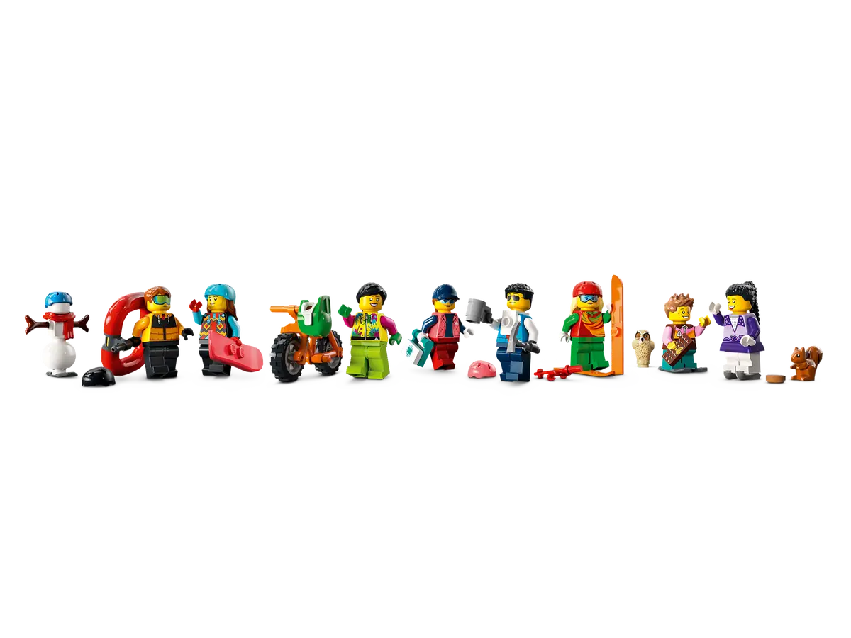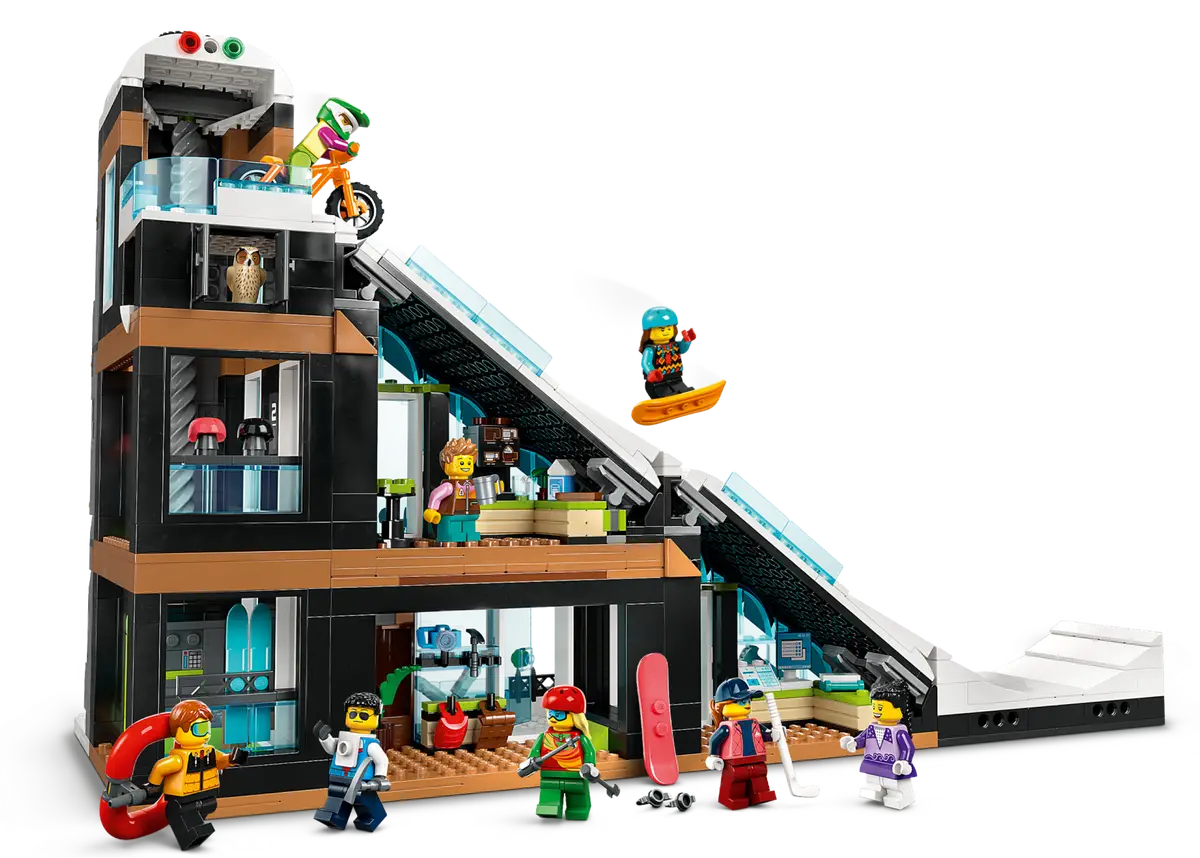 Inicialmente pensado para ser chamado de Winter Sports Park, 60366 Centro de Esqui e Escalada vem com oito minifiguras que possuem seus próprios acessórios de esqui, bem como um boneco de neve, uma coruja e um esquilo para combinar com a cena invernal. Há também um elevador funcional, uma bicicleta, um kit médico e até uma pequena câmera do tamanho de uma minifigura.