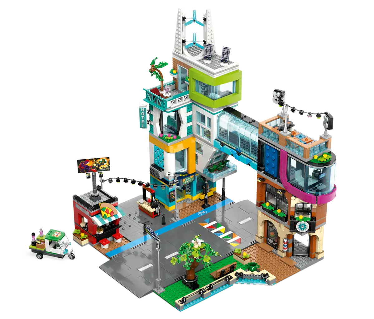 Renomeado de City Centro, 60380 Centro é um conjunto para maiores de 8 anos que inclui 14 minifiguras para completar o cenário da cidade. Com as imagens oficiais divulgadas, podemos ver que, como esperado, há muita coisa acontecendo, desde as áreas estilo praça de alimentação até a discoteca no terraço e a minifigura nervosa no barbeiro.