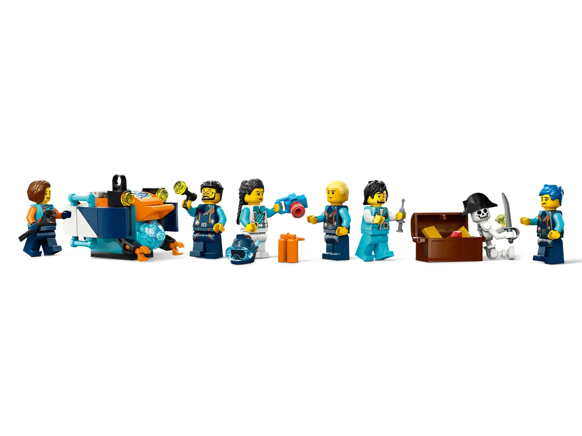 60379 Submarino Deep Sea Explorer mostra que o LEGO Group está realmente de acordo com o tema da exploração, com o conjunto incluindo um laboratório de ciências, um traje de mergulho estilo mecânico e seis minifiguras para explorar o mar. Há também alguns tubarões circulando à espreita perto de um naufrágio que também abriga algumas águas-vivas, e também há um esqueleto próximo.