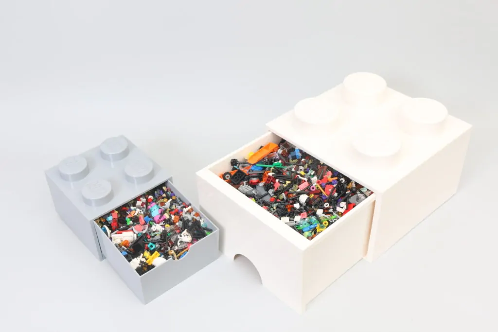 As gavetas de armazenamento de tijolos de grande escala também estão disponíveis no formato de 2 × 4 tijolos, oferecendo exatamente o dobro do armazenamento total - 9.4 litros - em um design de duas gavetas.