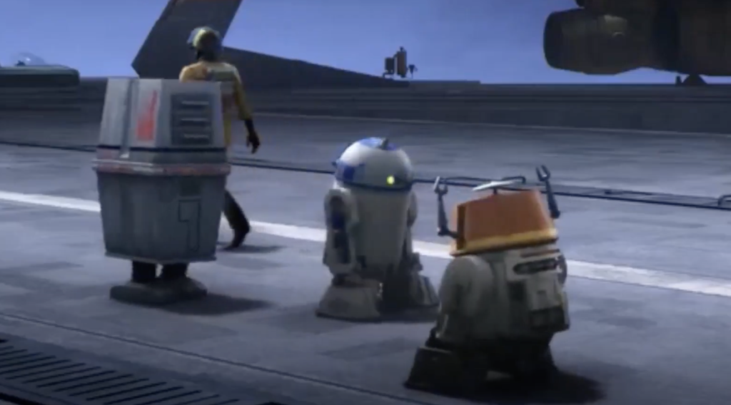 O corte é um pouco mais curto que Artoo, em linha com a forma como os dois astromecânicos se posicionam um ao lado do outro na tela, como em esta cena de Rebels, ilustrado abaixo. Você também pode ver as diferenças de estilo entre os dois astromecânicos, com os pés mais largos e os apêndices extras de Chop sendo algumas das diferenças mais notáveis.