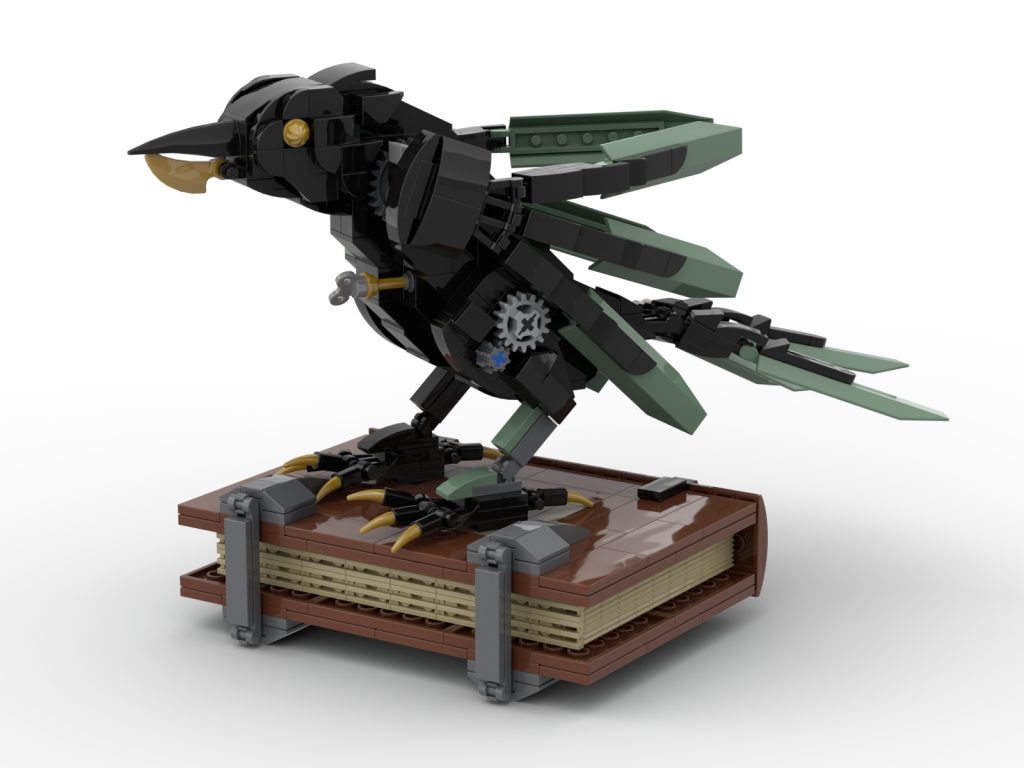 O Mechanical Raven da Brickjester oferece um modelo menor do que muitos dos apresentados na segunda série do BrickLink Designer Program, mas ainda contém muitos detalhes em cima de um livro feito de tijolos.