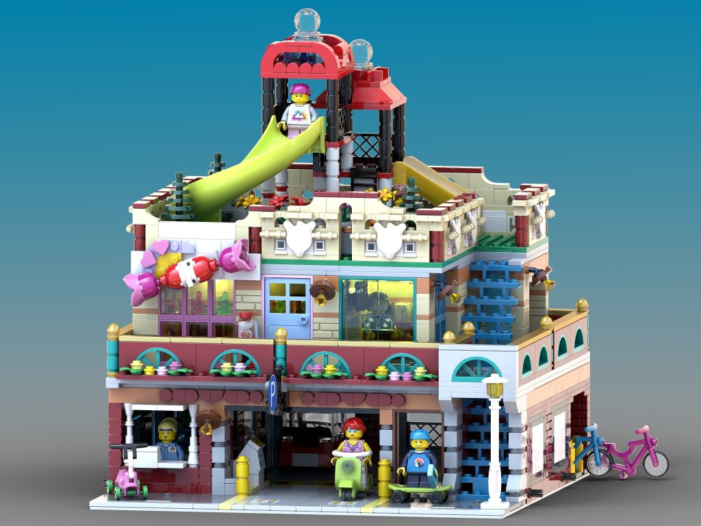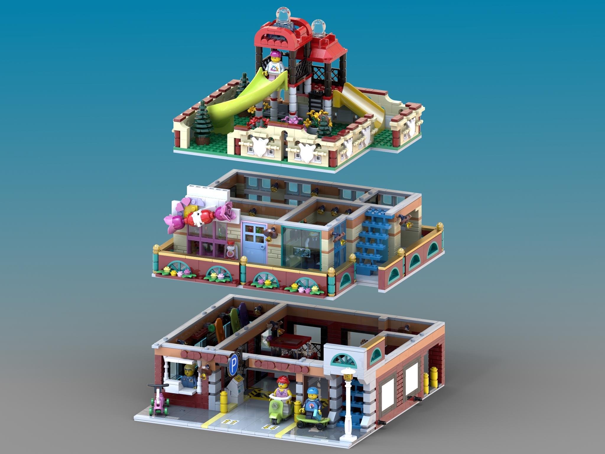 Aquele playground de dois andares pode não parecer seguro, mas no mundo do LEGO, esta escola modular é perfeitamente aceitável e completa com estacionamento para o corpo docente.