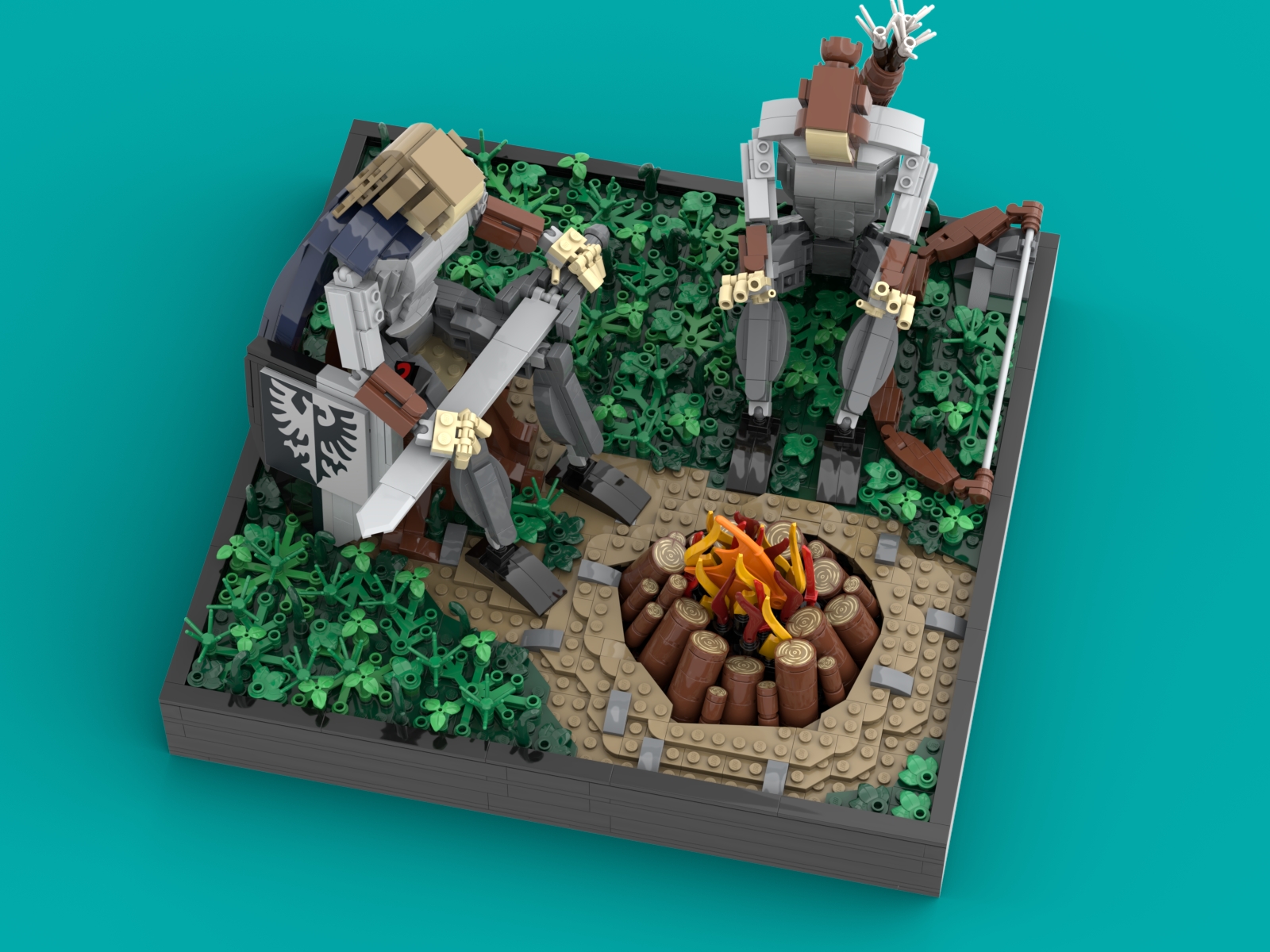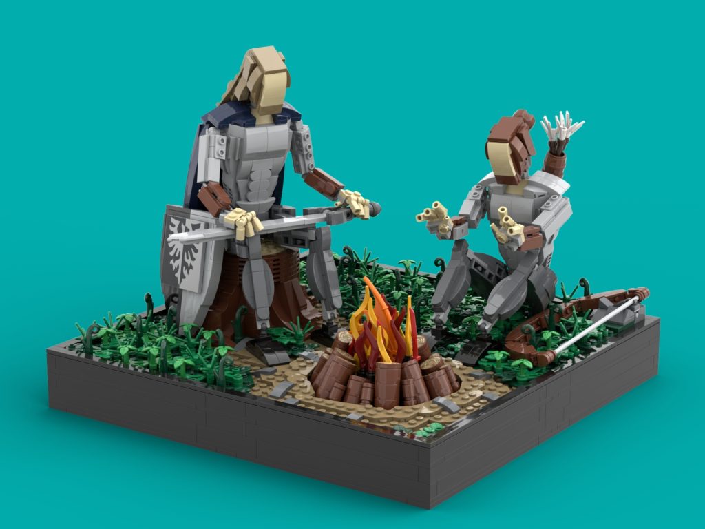 Fazendo referência ao Castelo LEGO, mas de uma forma diferente de qualquer modelo oficial, essas figuras construídas em tijolos usam inteiramente peças do Sistema para representar um par de cavaleiros cheios de personalidade, descansando perto de uma fogueira.